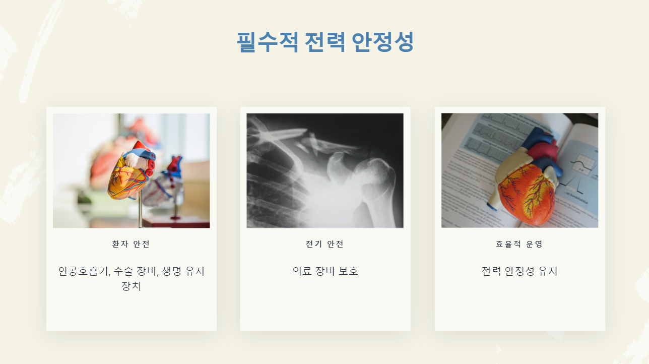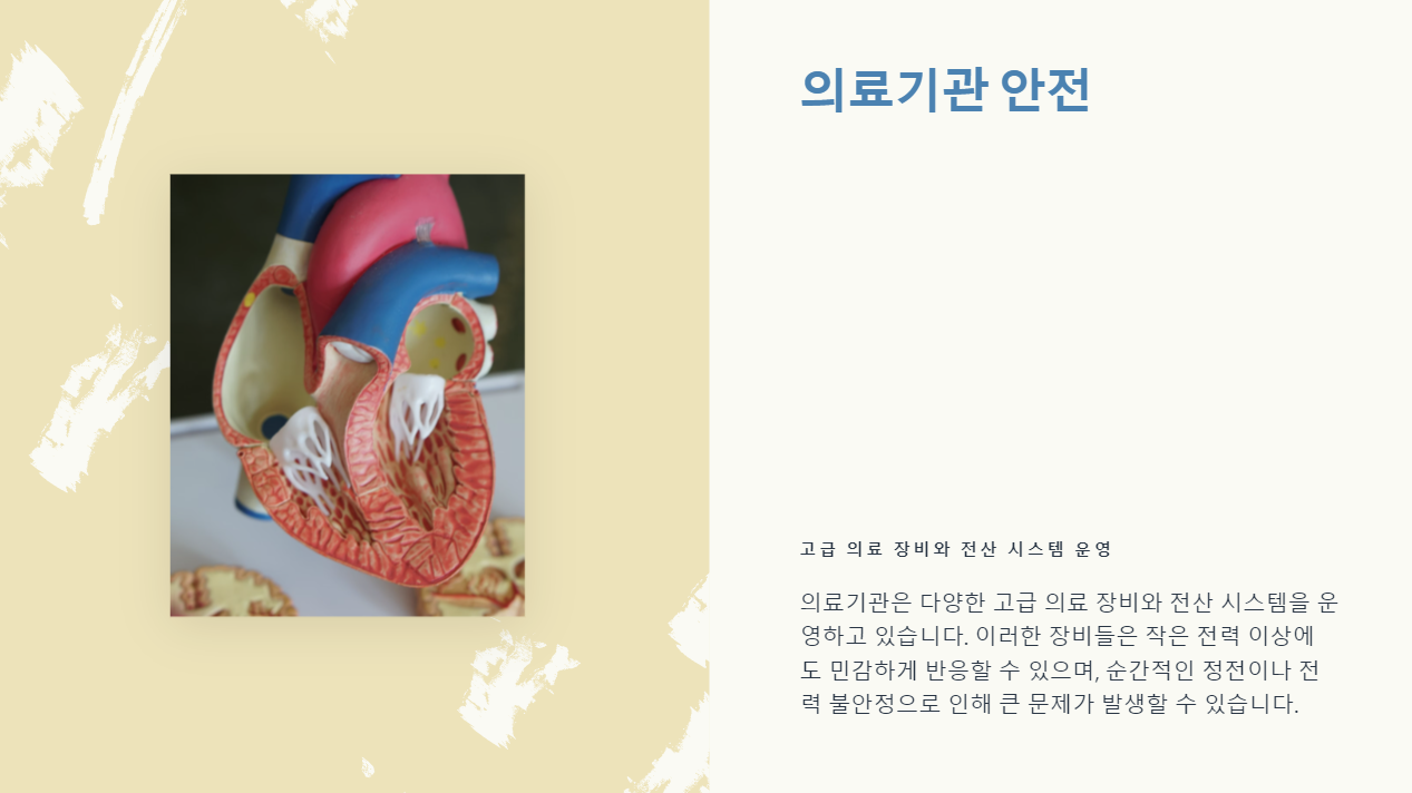 의료기관은 다양한 고급 의료 장비와 전산 시스템을 운영하고 있습니다. 이러한 장비들은 작은 전력 이상에도 민감하게 반응할 수 있으며, 순간적인 정전이나 전력 불안정으로 인해 큰 문제가 발생할 수 있습니다. 특히, 인공호흡기, 수술 장비, 생명 유지 장치 등은 안정적인 전력 공급이 필수적입니다. 만약 전기 안전이 제대로 관리되지 않으면, 환자의 생명과 직결된 문제를 초래할 수 있습니다.