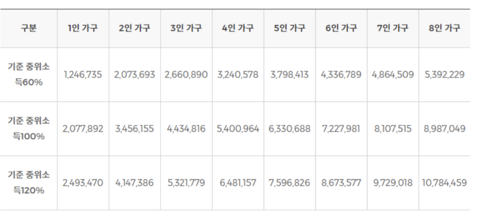 해당 표를 참고 하시면서 중위소득에 대한 구간을 확인 하시기 바랍니다.